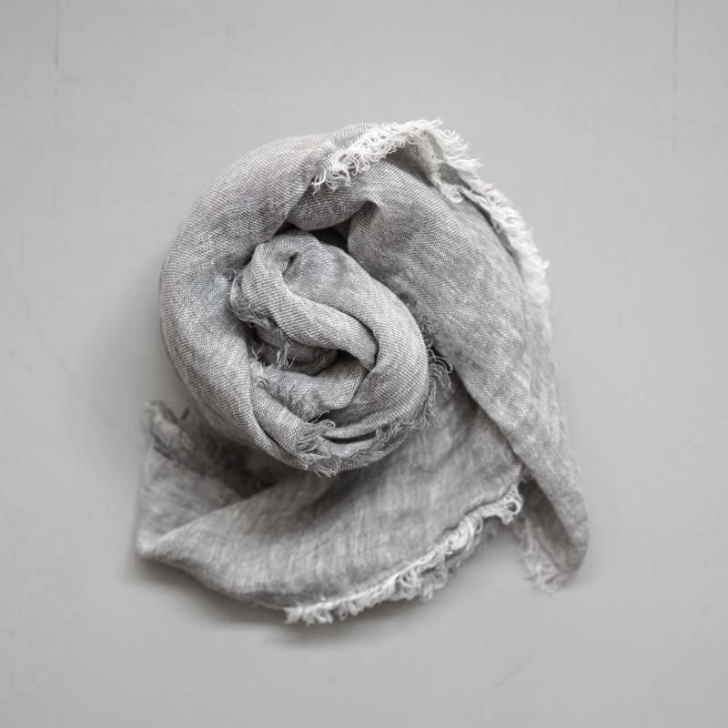 経糸にホワイト、緯糸にグレーの糸を用いざっくりと織り上げた透け感のある生地を四方フリンジ加工で仕上げています。装いに合わせてスタイリングができるよう、適度な糸の太さ、空気を含む織りの密度、巻いた時に使いやすい大きさで作られています。形が崩れにくいよう、端は絡み合うようフリンジ仕立てにし、使い始めからソフトな風合いと柔らかな凹凸になるようウォッシュド加工も施して。