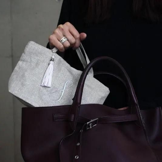 亜麻の生糸にシルバーの糸を織り込んだこの生地は、シックななかにも品のある華やかさが魅力。色や柄ものの和装にも相性が良くハンドルが柔らかな共布でできているのでお太鼓に仕舞う事ができます。